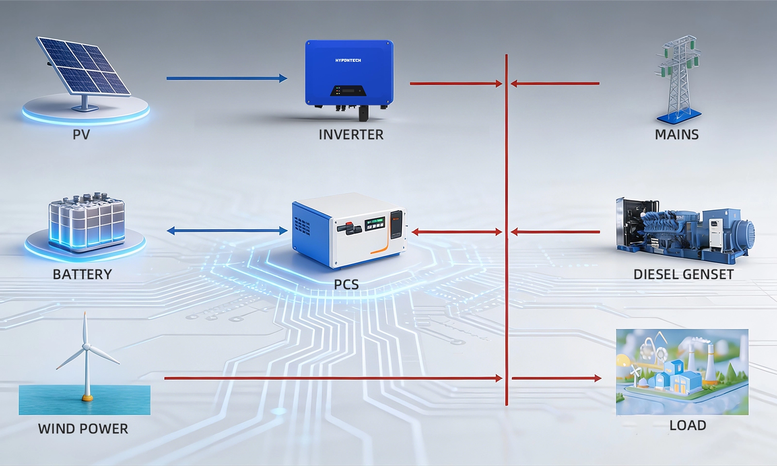 智能混合电源管理系统,可自主控制发电机、电池存储、光伏、风能和主系统之间的电力分配,从而优化整个系统最经济的电源管理组合。它提供用户友好的界面,可在任何情况下选择理想的运行模式,确保安全、高效和可靠的能源供应。